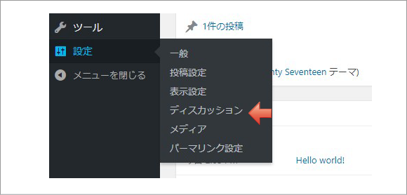 1. 管理画面「設定」>「ディスカッション」をクリックします。