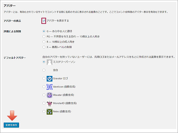3. コメントを受け付ける場合は、「アバターを表示する」にチェックを入れておきましょう。設定終了後、「変更を保存」をクリックします。