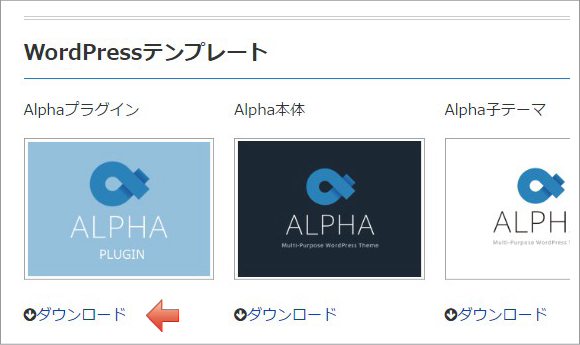 ALPHAメンバーサイト「WordPressテーマダウンロード」ページを開き、「Alphaプラグイン」のダウンロードをクリックします。(※Alpha購入者のみアクセス可能)