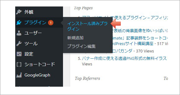 「プラグイン」>「インストール済みプラグイン」をクリックします。