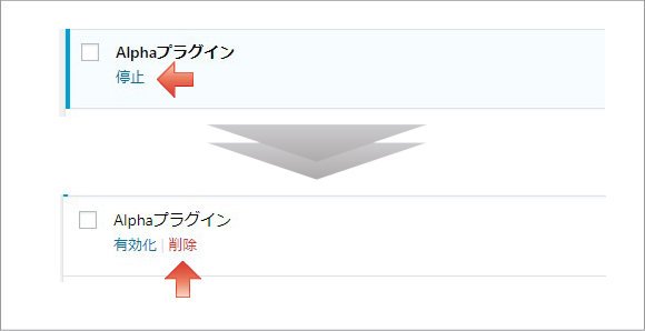 Alphaプラグインの「停止」をクリックします。次に「削除」をクリックします。プラグインを削除しても、Alphaのテーマ(本体・子テーマ)はそのまま残ります。