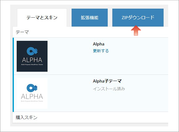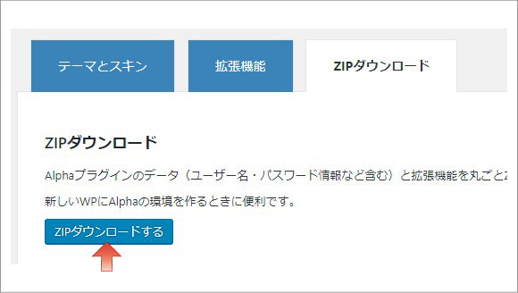 「ZIPダウンロードする」をクリックでAlphaプラグインをダウンロードできます。Alphaプラグインのデータ(ユーザー名・パスワード情報など含む)と拡張機能が入っていますので、新しいワードプレスにAlphaの環境を作るときに便利です。
