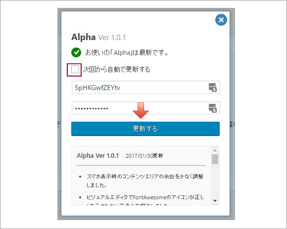 バージョンアップをする場合、ダッシュボード>「Alphaプラグイン」をクリックします。