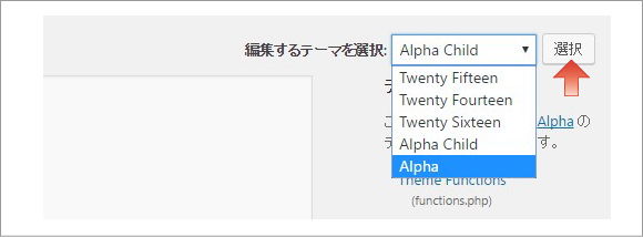外観>テーマの編集をクリックします。編集するテーマを選択で「Alpha」を選び「選択」をクリックします。