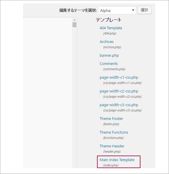 ALPHA本体と子テーマに同一名称のファイルがある場合、子テーマにあるファイルが優先されます。例えばindex