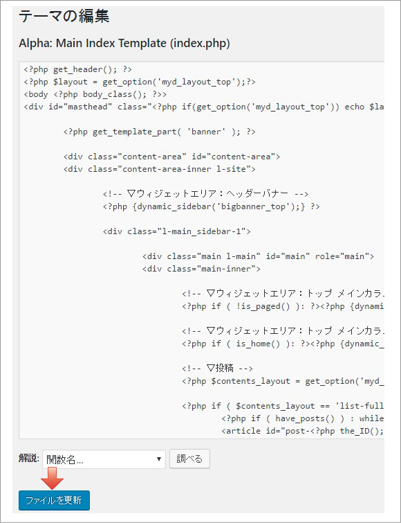 カスタマイズするphpをクリックします。編集が完了したら「ファイルを更新」をクリックします。他のphpを編集する場合は、同じ手順で作業をします。