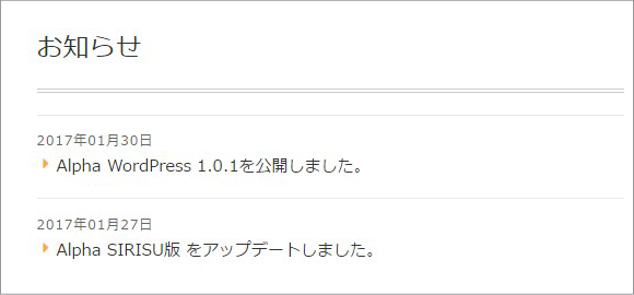 個々のphp(index.php・single.phpなど)のカスタマイズ内容をテキストファイルにまとめておきます。Alphaメンバーサイトのお知らせでバージョンアップ情報を掲載しています。