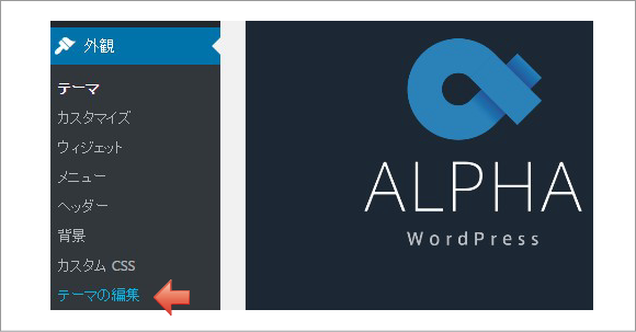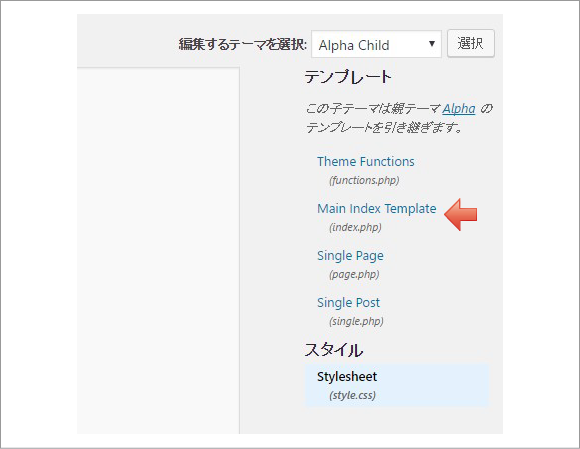 外観>テーマの編集をクリックします。編集するテーマを選択で「Alpha Child」にコピーしたphpが表示されているか確認します。