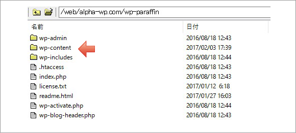 次にFFFTPでALPHAをインストールしたホルダーを開き「wp-content」をクリックします。