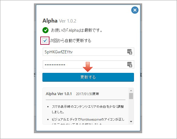 「次回から自動で更新する」のチェックを入れ、「更新する」をクリックします。これでAlpha本体は最新バージョンになっています。