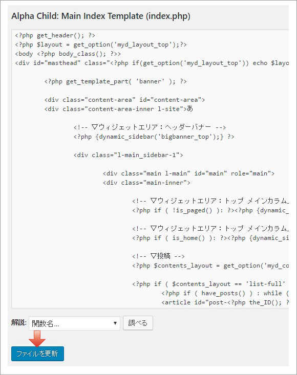 カスタマイズするphpをクリックします。編集が完了したら「ファイルを更新」をクリックします。他のphpを編集する場合は、同じ手順で作業をします。