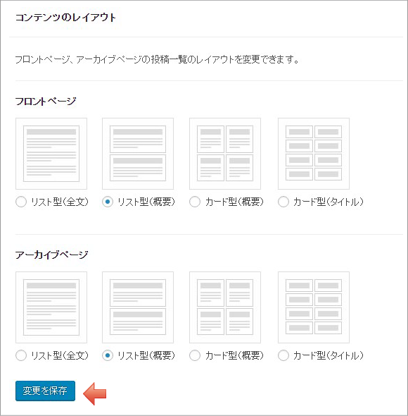 2. フロントページ、アーカイブページの投稿一覧のレイアウトを変更できます。選択後「変更を保存」をクリックします。