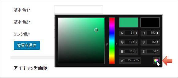 フォームをクリックするとカラーピッカーが現れますので、色を選んでから右下の虹色の丸をクリックして決定してください。基本色1はグローバルメニュー背景、記事タイトルしたラインなどの色で、基本色2は矢印などの色になります。設定が完了したら「変更を保存」をクリックします。(※グローバルメニュー背景色はデザイン:Luster・Vent・Soberに対応しています。)